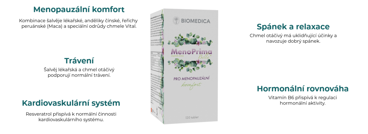 Doplněk stravy MenoPrima Bella® 120 tbl. byl vyvinut díky inovativnímu zpracování chmele, na kterém spolupracovala VŠCHT Praha, Chmelařský institut s.r.o. v Žatci a Biomedica, spol. s.r.o. v rámci projektu TAČR TE02000177.